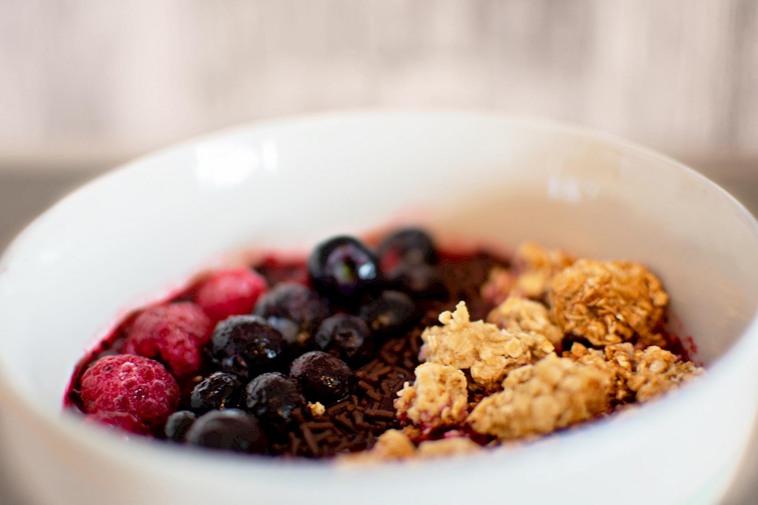 Meine Lieblingsbowl ist eine Basis aus gemischten Beeren (meistens tatsächlich eine Tiefkühlmischung) mit einem Topping aus selbstgemachtem Crunchy-Müsli, Haferflocken, Schokoladenraspeln und einigen frischen Erdbeeren oder Heidelbeeren.